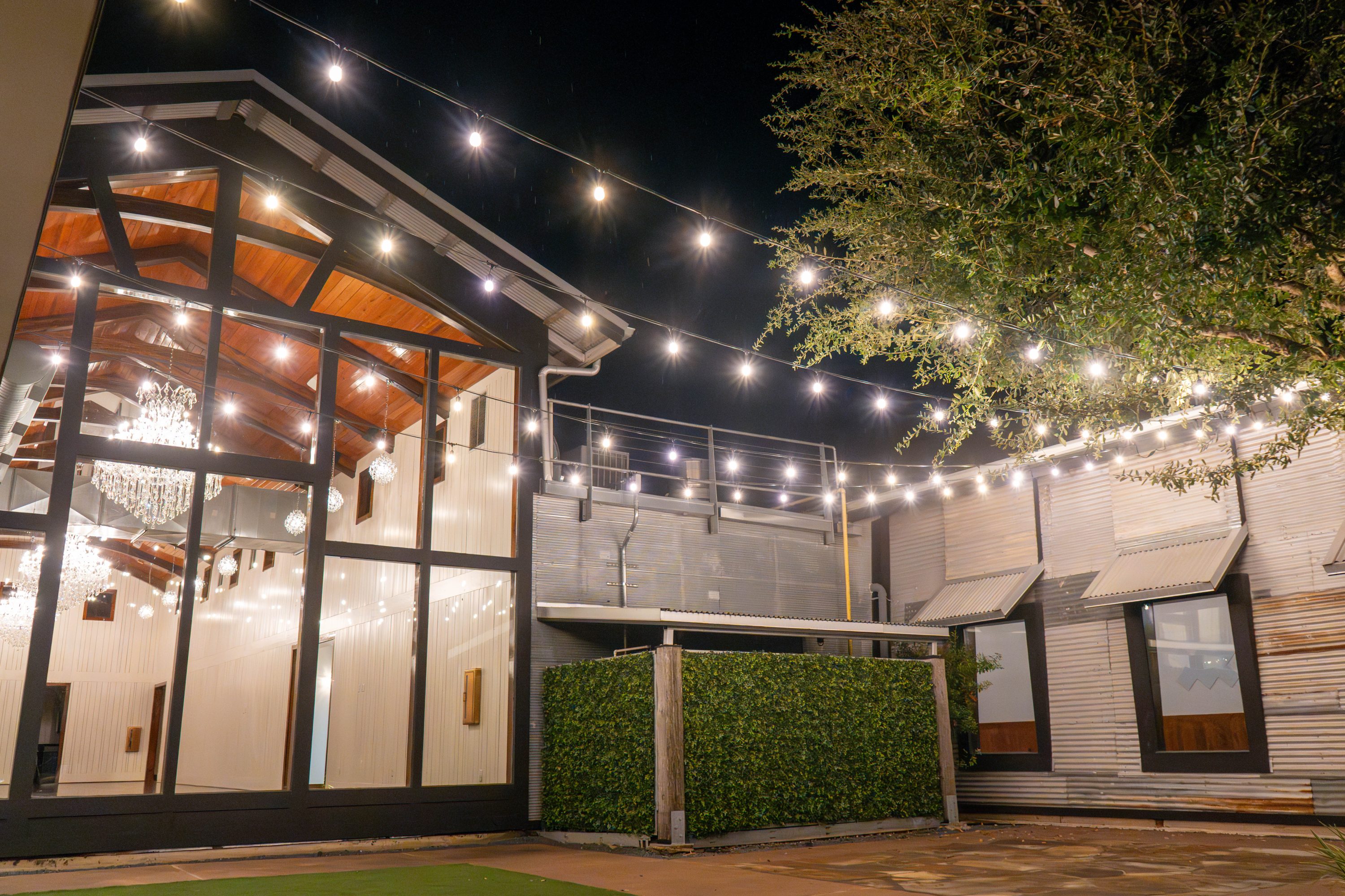 Now, as guests arrive at Venue 116, they’re greeted by a warm, inviting glow that instantly sets the mood. The tree uplighting and string lights across the courtyard create a romantic ambiance perfect for weddings, parties, and evening events.